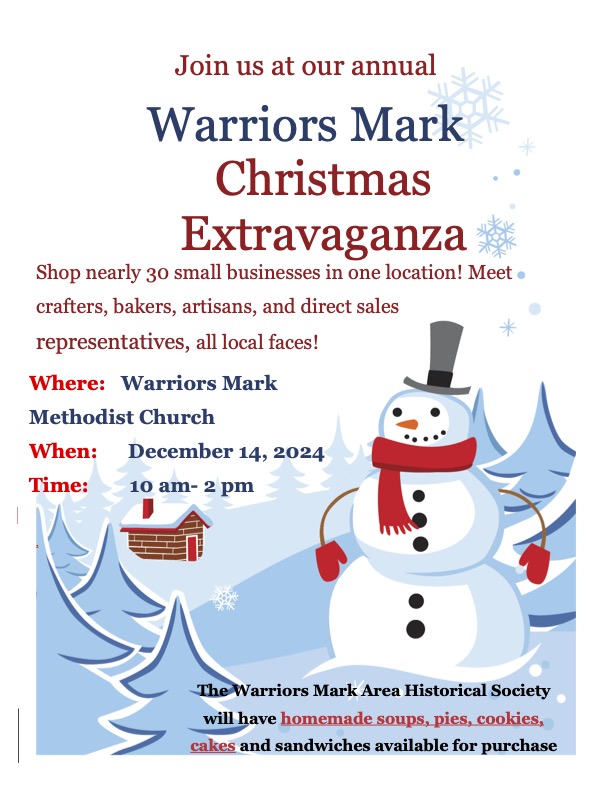 Join us at the Warriors Mark Methodist Church on December 14, 2024 from 10 am to 2 pm for our annual Warriors Mark Christmas Extravaganza. We will have crafters, bakers, artisans, local businesses, and more. It will be a great opportunity to do some Christmas shopping in the community of Warriors Mark. See you there.